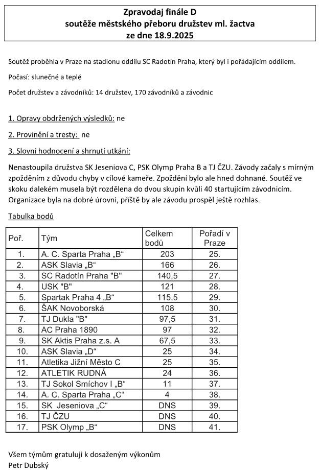Družstvo mladšího žactvo se 18.9.2025 v Radotíně rozloučilo s letošní závodní činností. Během jarní a podzimní sezóny nás čekalo 6 závodů a naším největším problémem nebyly dvojboje v kvalifikačních kolech, ale malá účast na závodech. A to je taky důvod proč jsme nakonec bojovali ve Finále D. I tam se nás bohužel sešlo málo, pouze 9 atletů a atletek, na dobrý výsledek to nestačilo. Skončili jsme na 32. místě v Praze. Škoda, protože v této skupině mladšího žactva jsou šikovní a bojovní atleti, ale právě malý počet startujících v jednotlivých kolech nás vždy odsunul téměř na konec bodované tabulky.